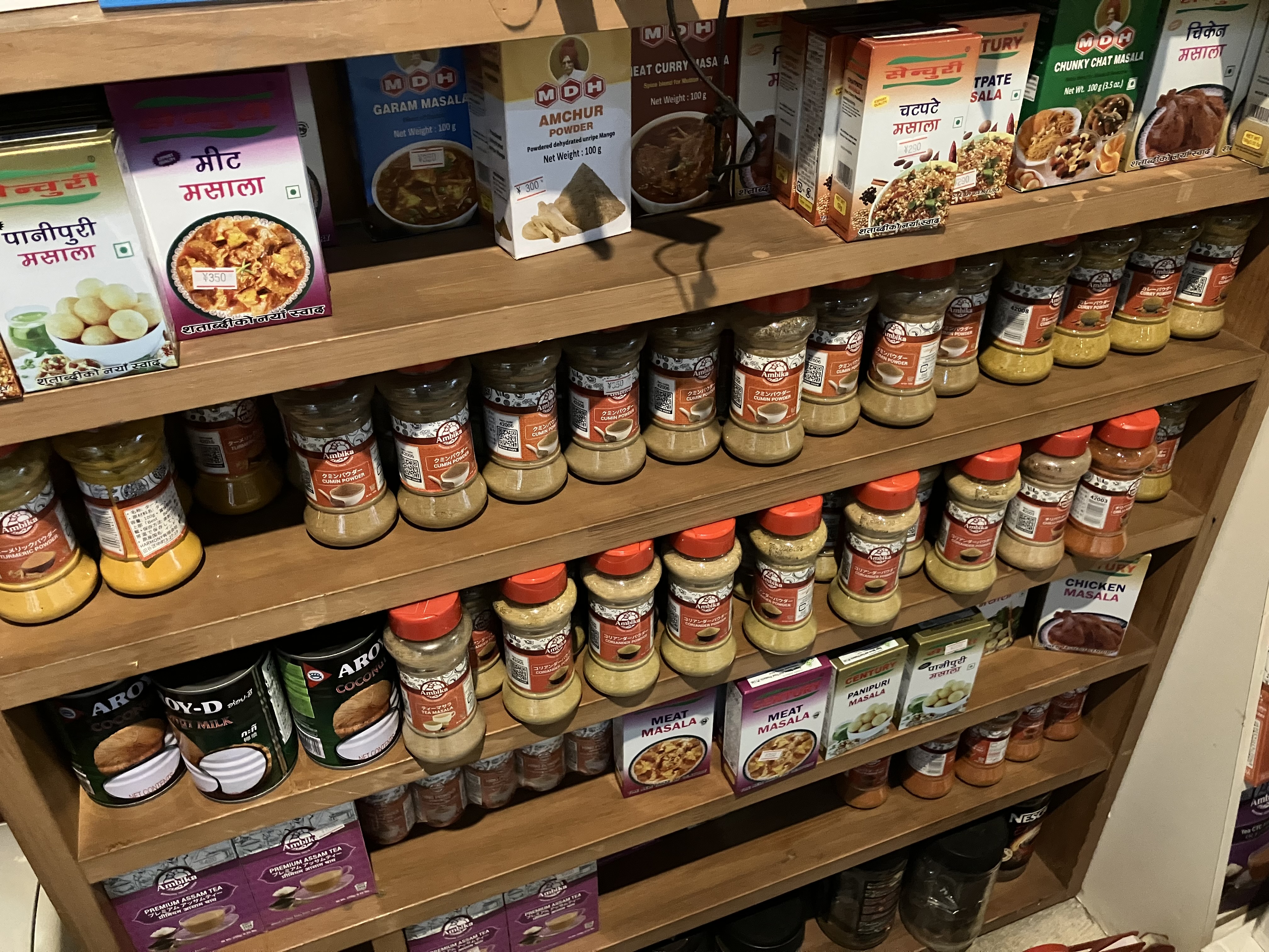 店内の一角には物販コーナーもあり、スパイスやお菓子、インスタントラーメンなど、現地の食材が並んでいました。