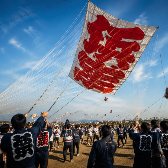 各町が自慢の凧を持ち寄り、空高く揚げる姿は圧巻です。