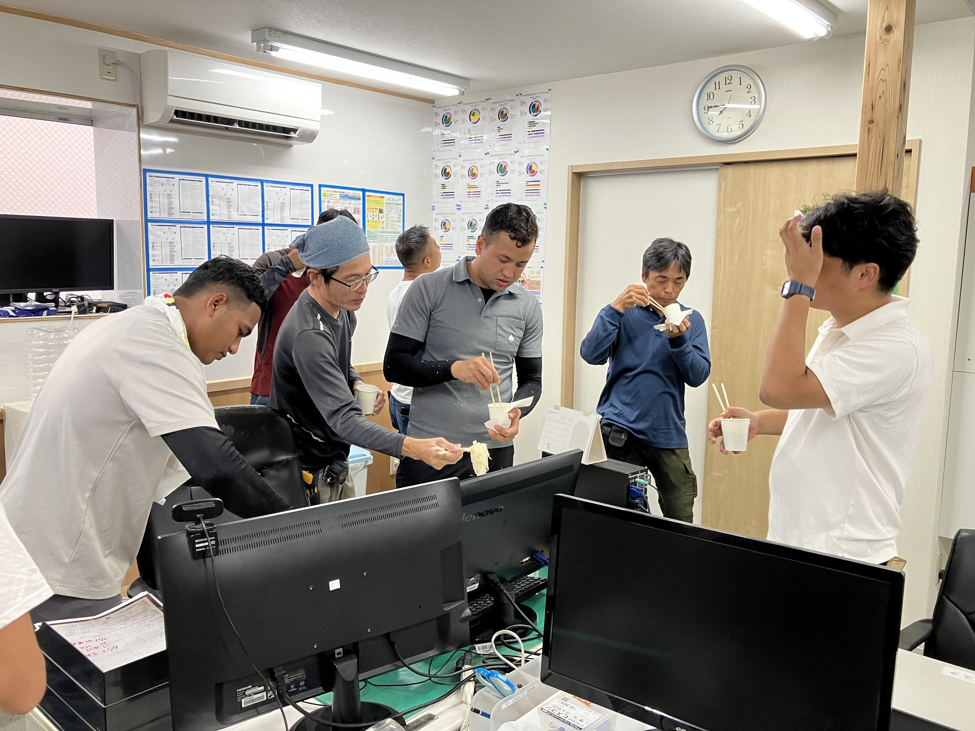 驚いた表情を見せた施工メンバーや営業スタッフでしたが、ひと口食べると「うまい!」「朝から最高!」と大盛り上がり。